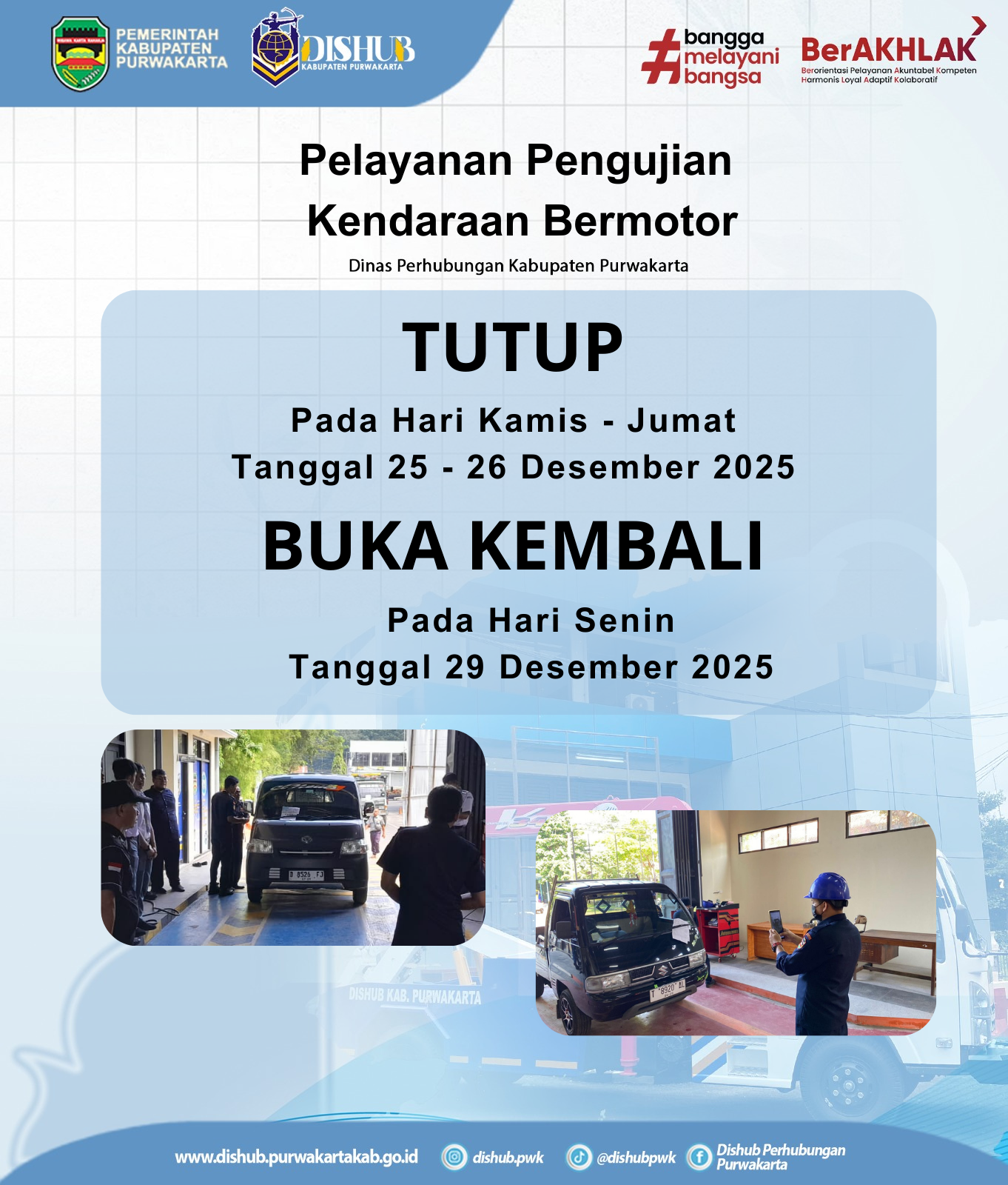 Dinas Perhubungan Kabupaten Purwakarta menginformasikan kepada seluruh masyarakat bahwa Pelayanan Pengujian Kendaraan Bermotor (Uji KIR) ditutup sementara dalam rangka libur nasional pada: