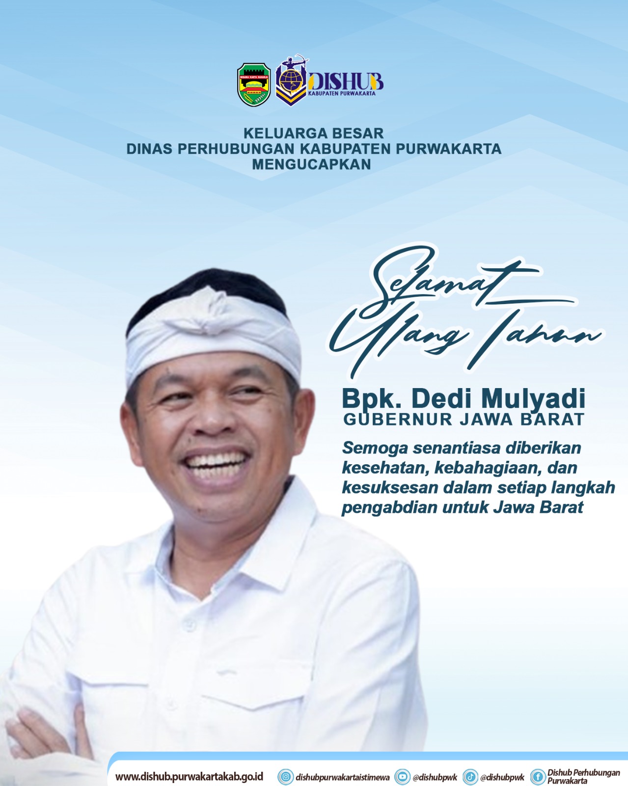 Keluarga Dinas Perhubungan Kabupaten Purwakarta mengucapkan Selamat Ulang Tahun Bpk. Dedi Mulyadi Gubernur Jawa Barat Semoga senantiasa diberikan