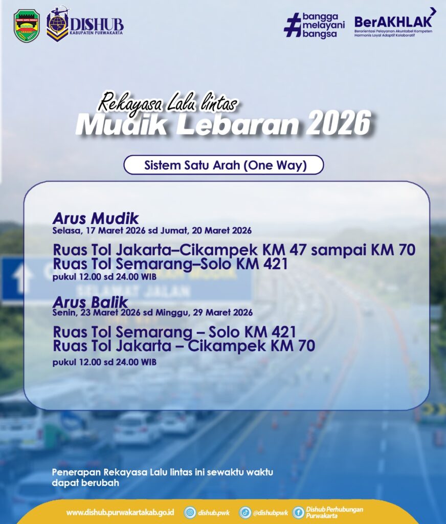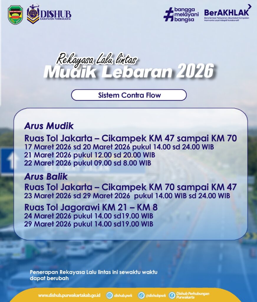 Untuk arus balik, rekayasa lalu lintas dijadwalkan mulai 23 – 29 Maret 2026. Para pengguna jalan diimbau untuk selalu memantau update waktu pelaksanaan karena jadwal ini dapat berubah sewaktu-waktu menyesuaikan kondisi diskresi Kepolisian di lapangan. Pastikan saldo e-toll mencukupi dan kondisi kendaraan dalam keadaan prima sebelum memasuki ruas tol. Sinergi antara Dishub Purwakarta dan Satlantas Polres Purwakarta berkomitmen memberikan pelayanan terbaik demi mudik yang aman dan berkesan.